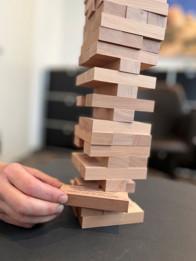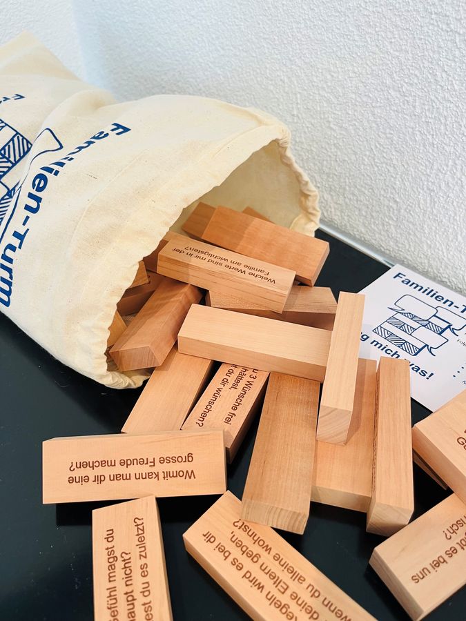 Der Familien-Turm verbindet auf einfache Weise Beratung und Spiel. Da die Spielidee des Wackelturms den Familien meist schon bekannt ist, kann sofort gespielt werden. 60 verschiedene Fragen zu den Themen Beziehungen, Werte, Stärken, Emotionen, Sicherheit, Aktivitäten, Regeln, System und Biografie laden die Familie zu spannenden Gesprächen ein.